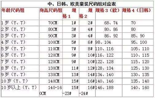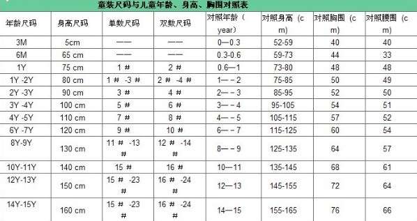 | 童裝尺碼 | 適合身高範圍 (cm) | 適合年齡 (歲) | 備註 |