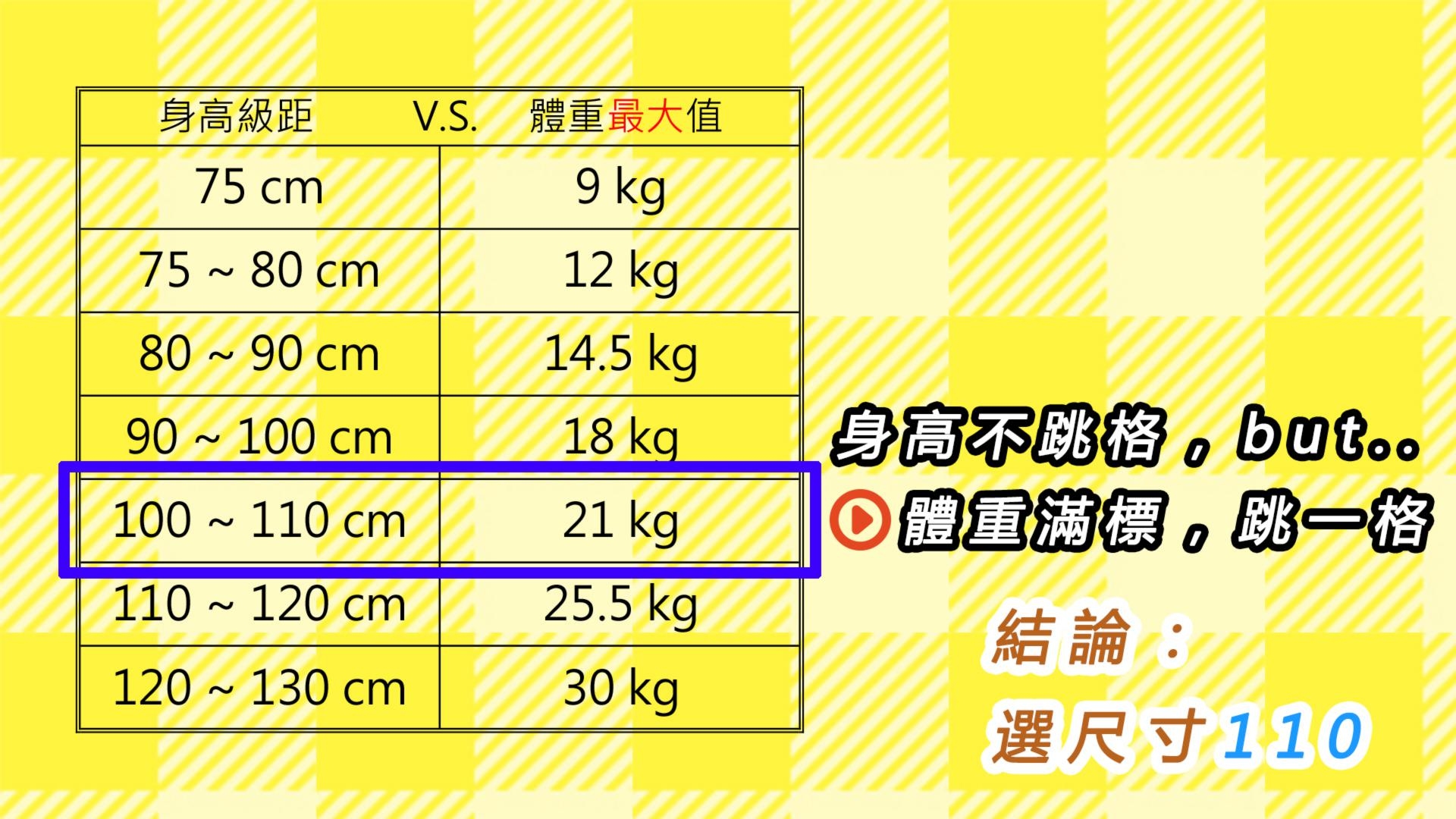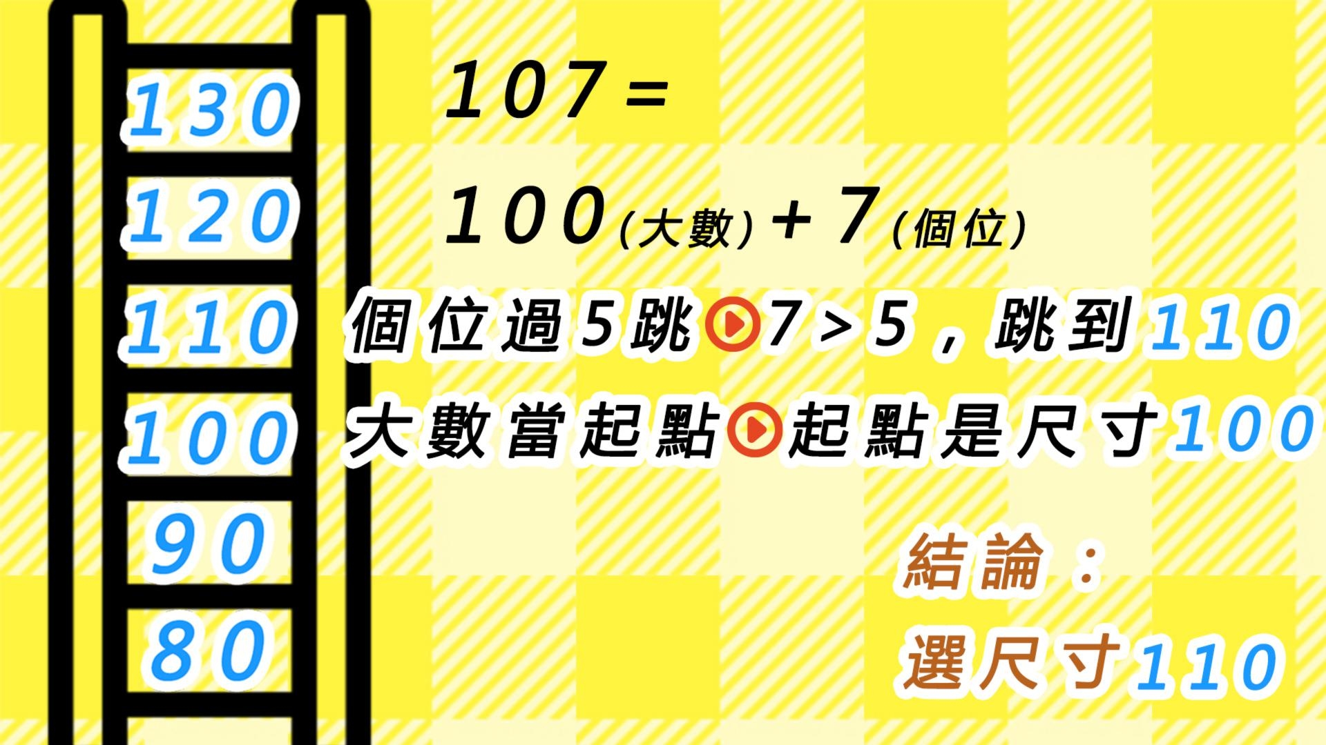 - 快速判斷口訣(0~6歲常用):以身高的「大數」(百位與十位)為基準尺碼,若身高個位數超過5,或體重達標,則尺碼往上跳一號。