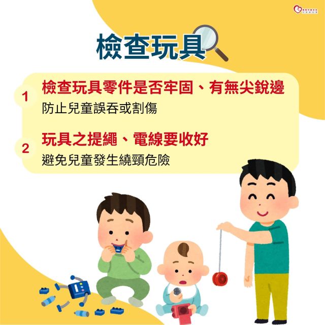 - 定期檢查玩具是否有損壞、脫漆或零件鬆脫,及時淘汰不安全的玩具。