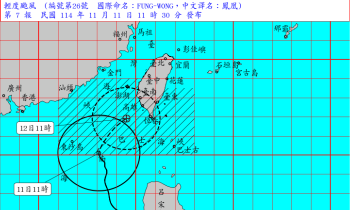 鳳凰颱風於11月12日晚間19時40分自屏東恆春登陸,登陸後不久即降為熱帶性低氣壓,中央氣象署已於12日晚間20時30分解除海上陸上颱風警報。颱風登陸後快速向東北方向移動,預計深夜自台東或恆春外海出海。