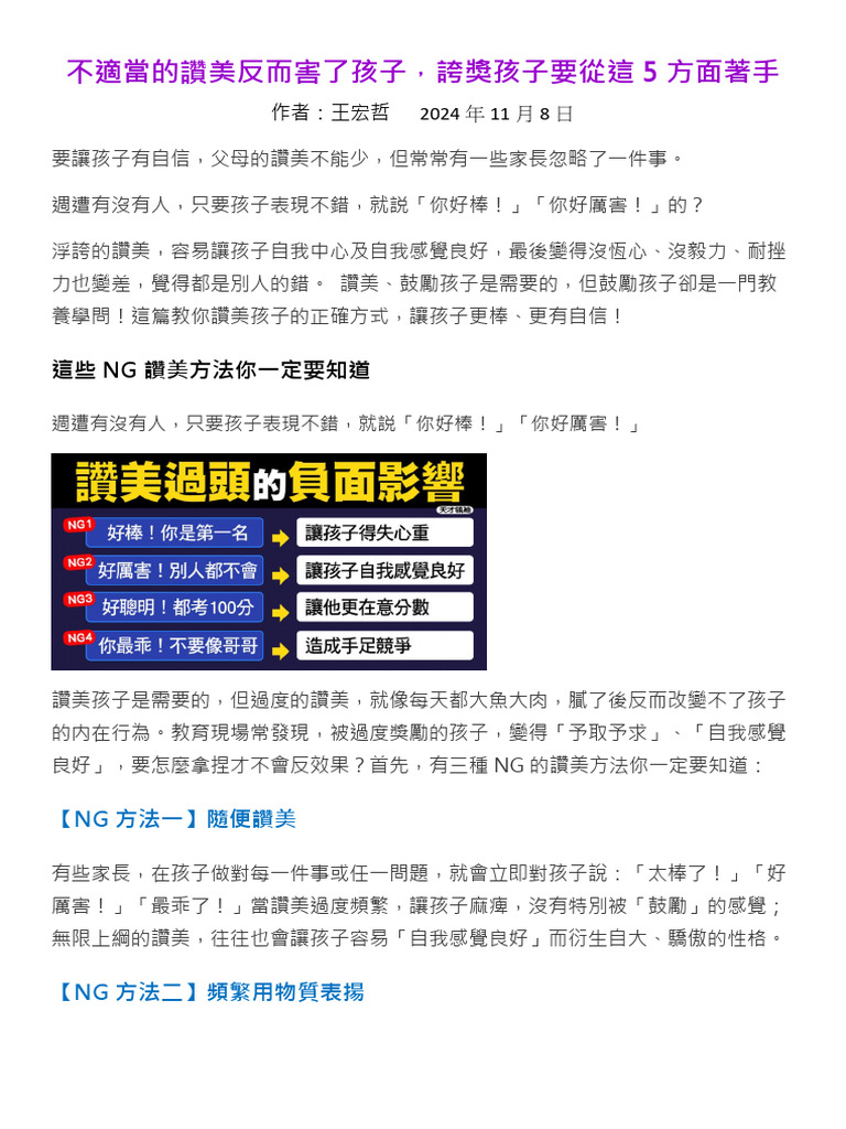 - 保持讚美的真誠與適度,避免頻繁且過度讚美,否則孩子可能產生自我感覺良好,甚至缺乏耐挫力和恆心。