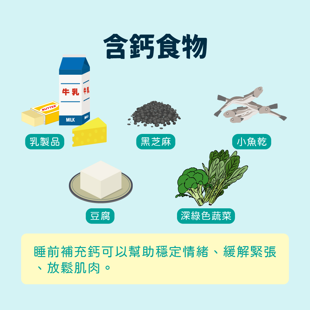 溫牛奶是睡前的理想選擇,因為含有色胺酸與鈣質,能幫助放鬆神經。鈣質具有安定神經、放鬆肌肉的作用。