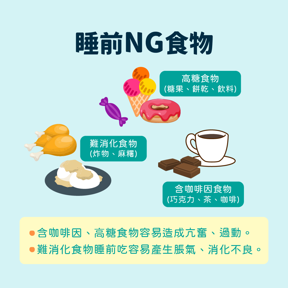 睡前應避免油炸物、辛辣物、高蛋白質、高油脂的食物,以免消化不良導致孩子不易入睡。