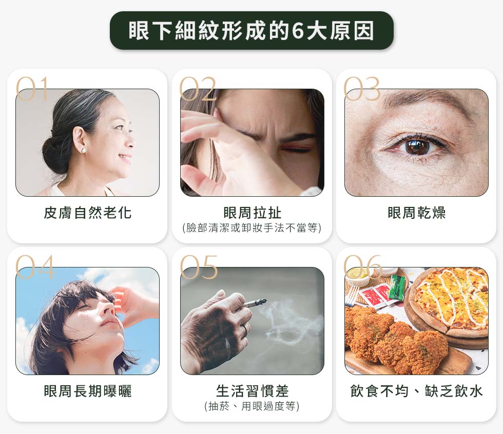 - 肌膚老化:隨著年齡增長,皮膚中的膠原蛋白與彈性纖維流失,導致眼周肌膚鬆弛、失去彈性,進而產生細紋。