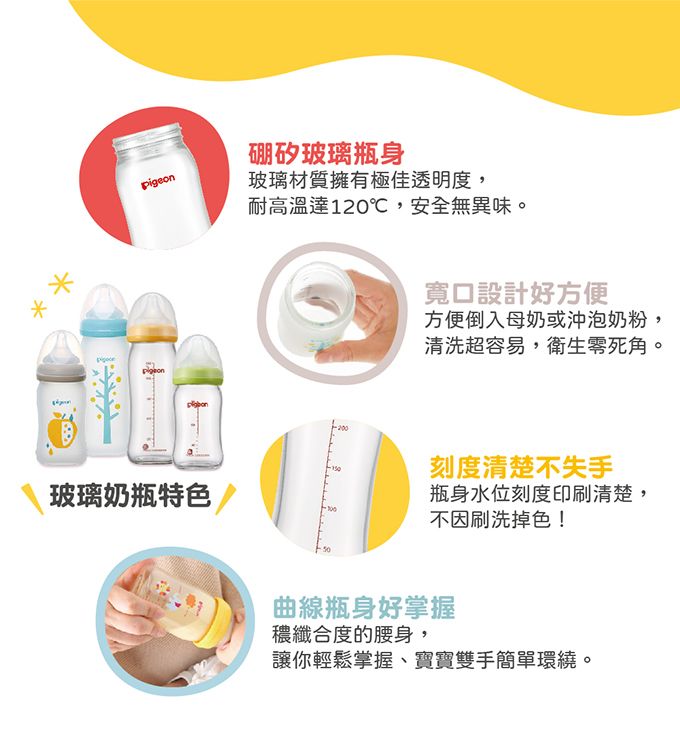 耐用且易清潔:玻璃瓶身耐磨耗,不易老化,且無接縫設計不易藏污納垢,不怕發霉,清洗及消毒方式多樣(蒸氣、紫外線、水煮皆可),不需頻繁更換奶瓶,節省成本。