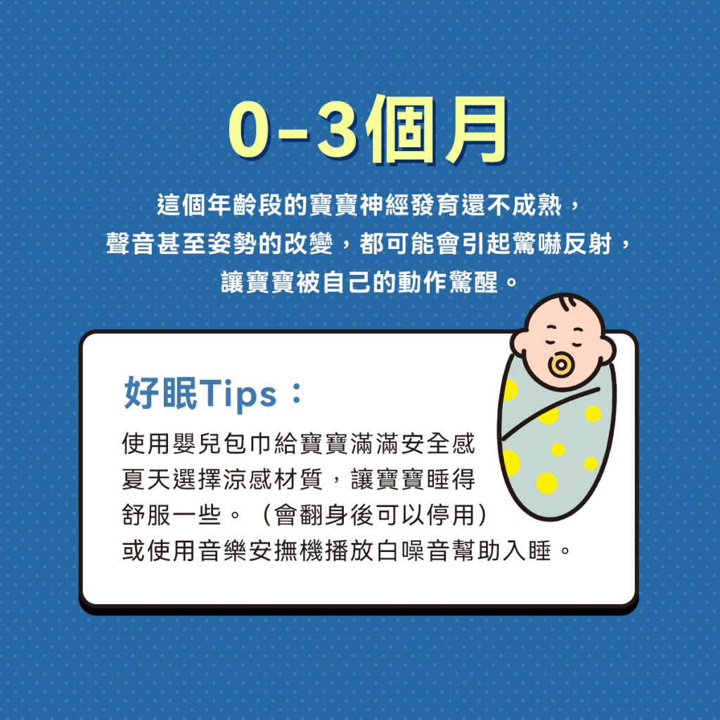 - 3~6個月大:寶寶的夜間睡眠時間會開始延長,夜醒次數逐漸減少,這是因為生理上逐漸能區分日夜,褪黑激素分泌趨於穩定。