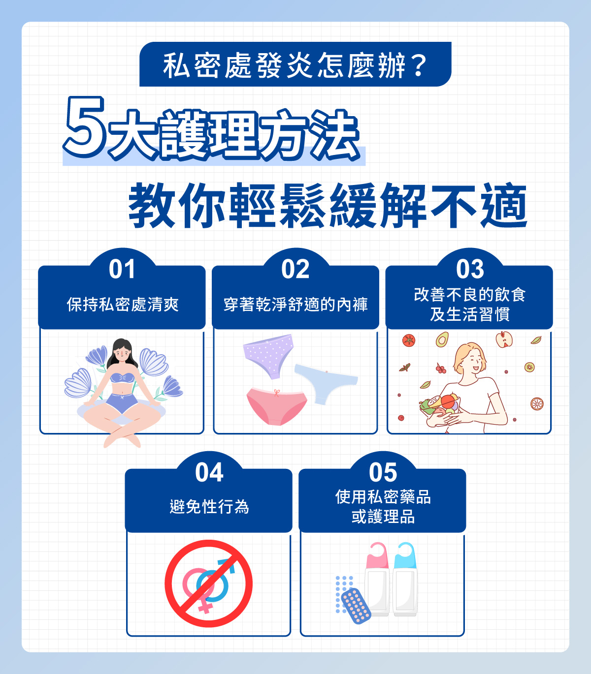 適度清潔私密處:每天用溫水清洗外陰部一次即可,避免過度清潔或使用刺激性肥皂,選擇專為私密處設計的溫和無香料產品。