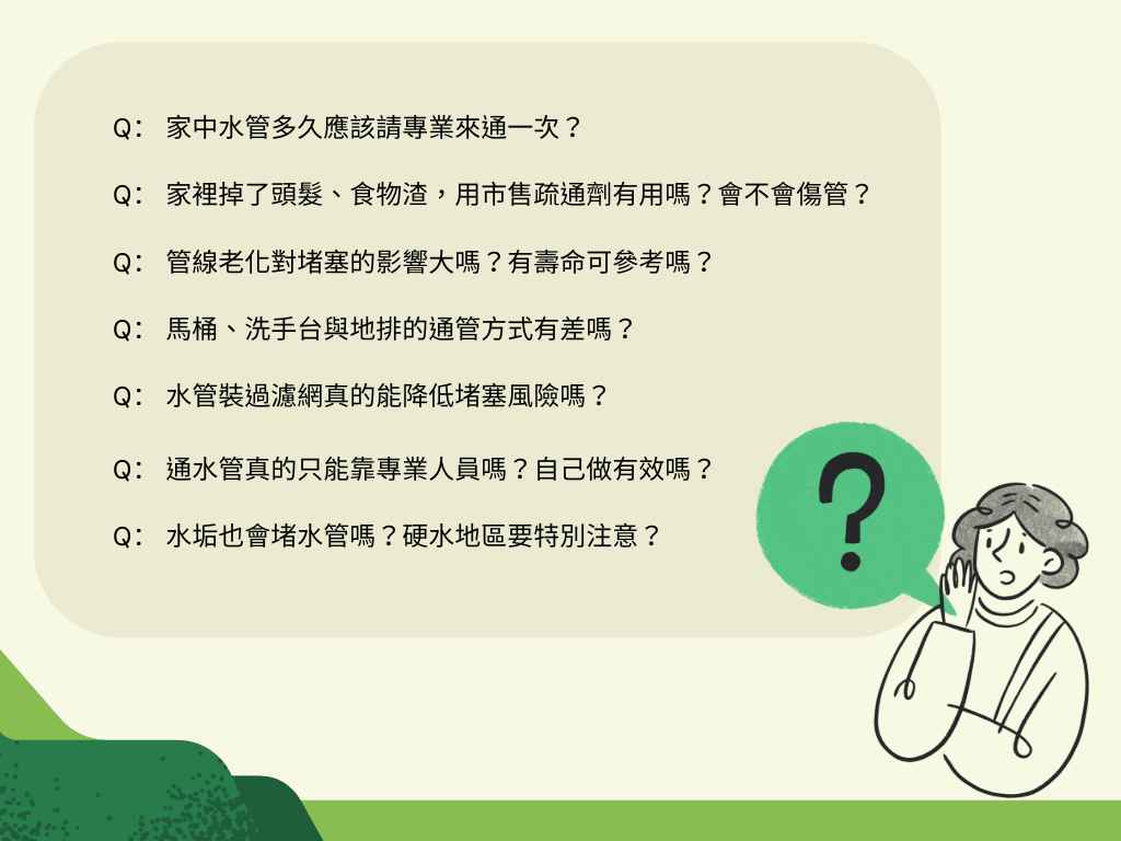 大樓的主排水管會匯集所有住戶的排水,累積性污垢過多可能導致排水不順。住戶若丟棄異物(如廚餘、衛生紙)至排水系統,也可能導致主幹管阻塞。