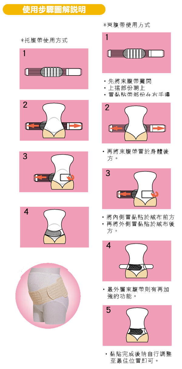 - 避免睡眠時使用:一般托腹帶不建議在睡覺時佩戴,但腹卷型托腹帶可依產品說明使用。