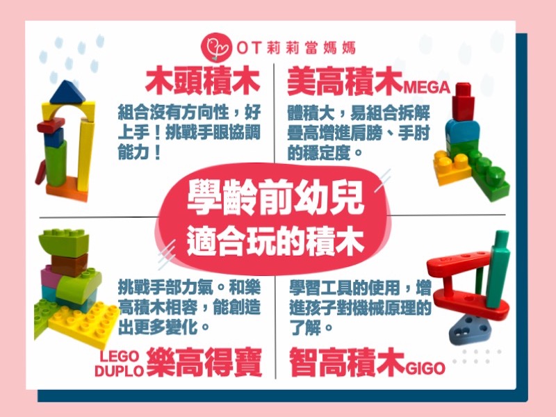 - 系列差異:得寶(Duplo)積木適合較小孩使用,積木較大且安全,與標準樂高積木可部分相容,但人偶等配件不相容。