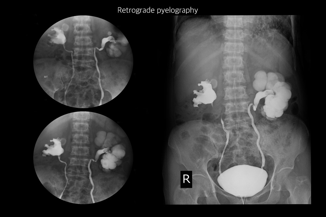 靜脈注射腎盂攝影術(IVP):注射顯影劑後,透過X光顯示腎盂、輸尿管和膀胱結構,評估尿路是否阻塞、結石大小與位置,並可偵測腎乳頭壞死、尿路逆流及慢性腎盂腎炎。