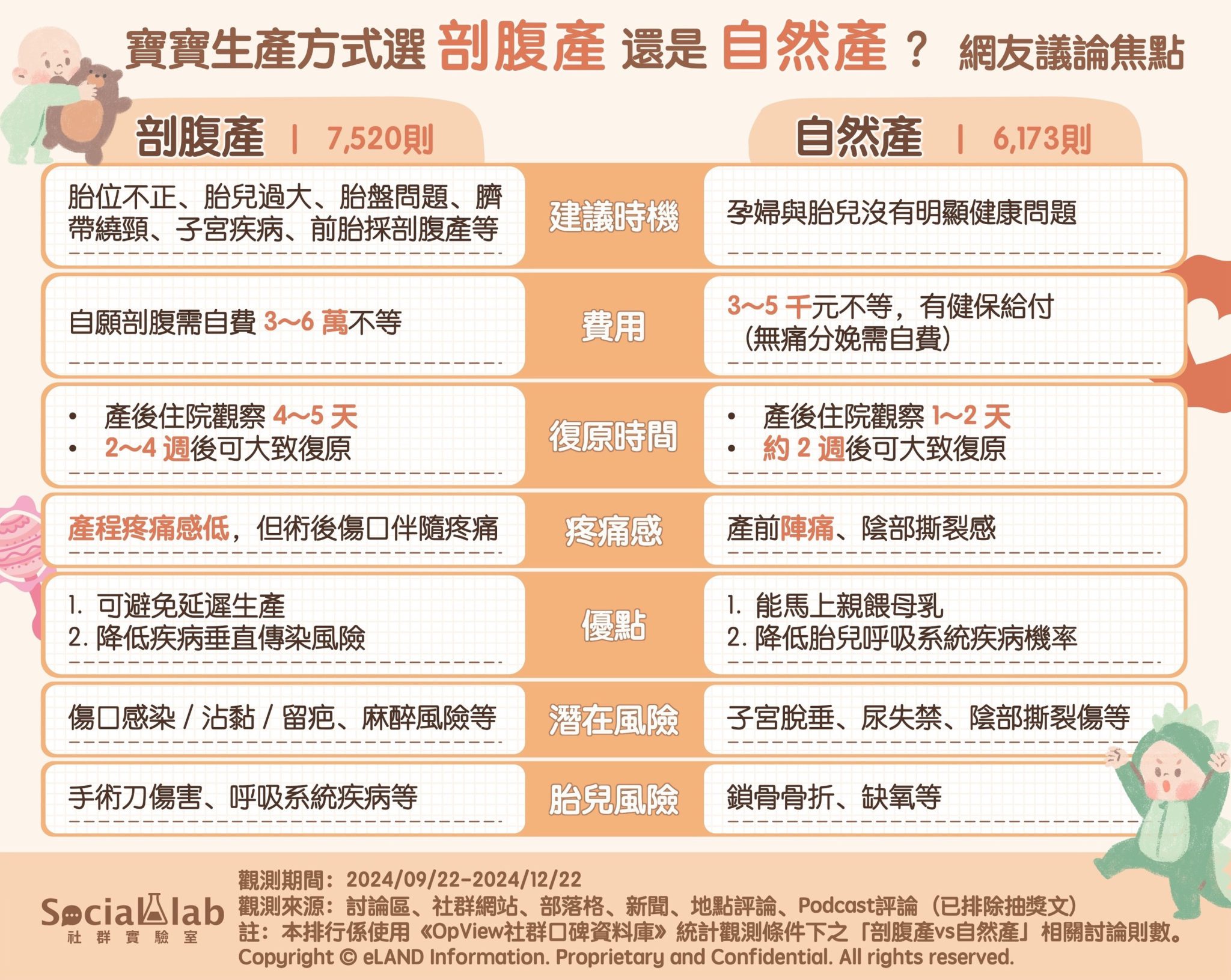 - 風險:自然產有產程遲滯或難產轉剖腹可能;剖腹產有感染、麻醉風險。 選擇依個人體質、醫師建議與胎兒狀況而定,無絕對優劣。