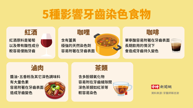 所以,食物與飲料透過色素附著、酸性侵蝕及黏稠附著等機制影響牙齒顏色,良好的飲食選擇與口腔清潔是維持牙齒潔白的關鍵。