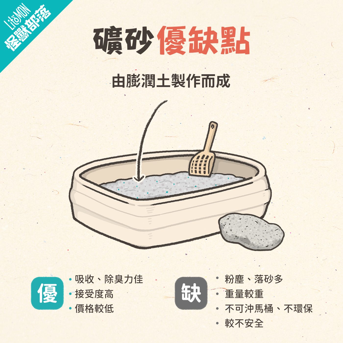 | 其他 | 觸感近土壤,貓接受度高;份量重 | 易受潮;礦型豆腐砂粉塵略多但包覆更好 |
