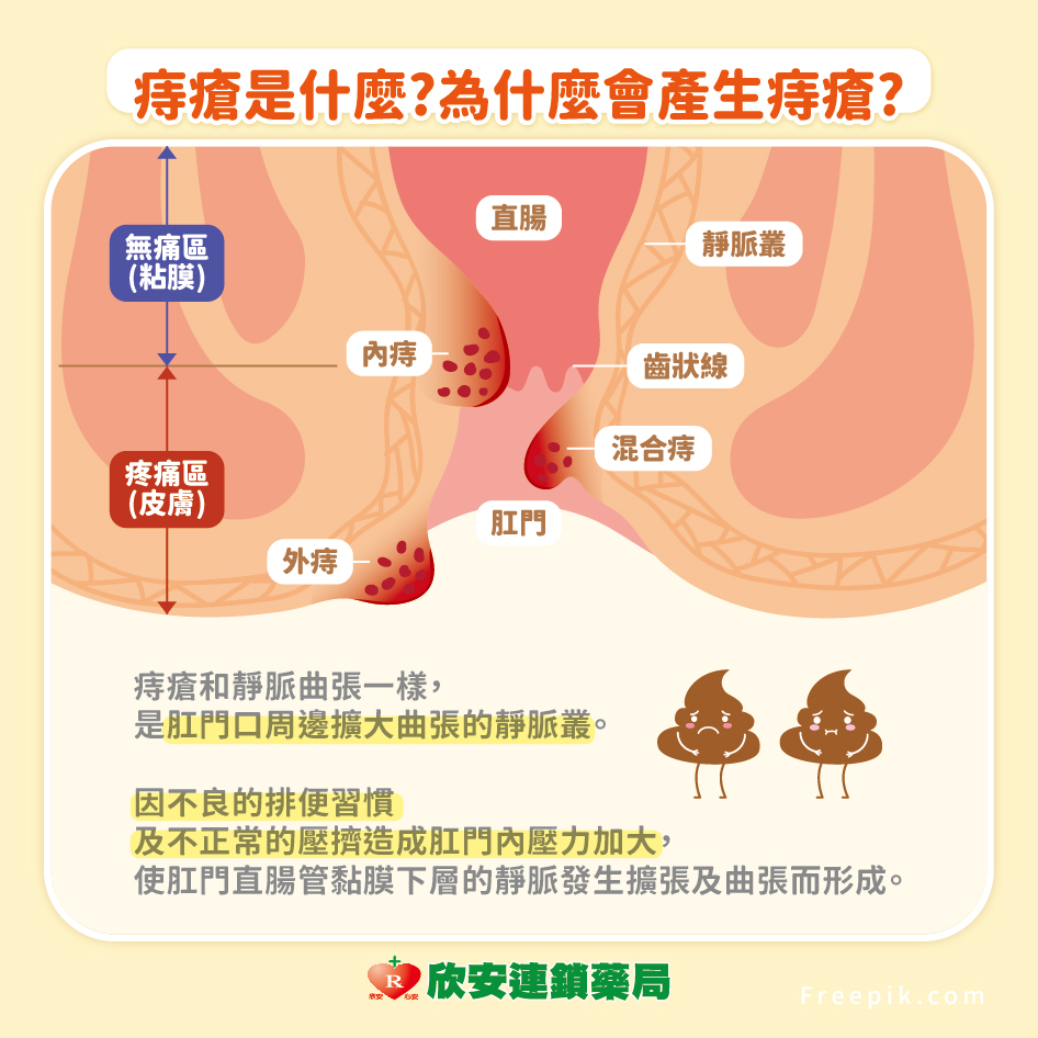 - 惡性循環:痔瘡疼痛使患者畏懼排便,減少排便次數,糞便水分過度吸收變硬,進一步加劇便秘與痔瘡,可能併發肛裂或肛瘻。
