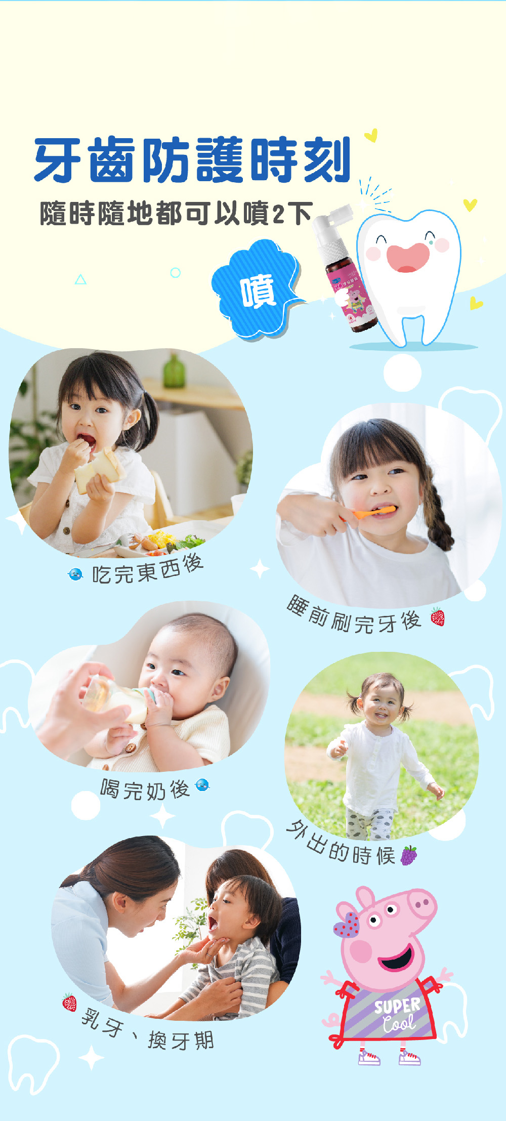 - 已長牙幼童使用:可在三餐後、刷牙後、睡前或夜奶後使用;常見建議為每次對牙齒噴2–3下,不需再漱口(以產品說明為主)。