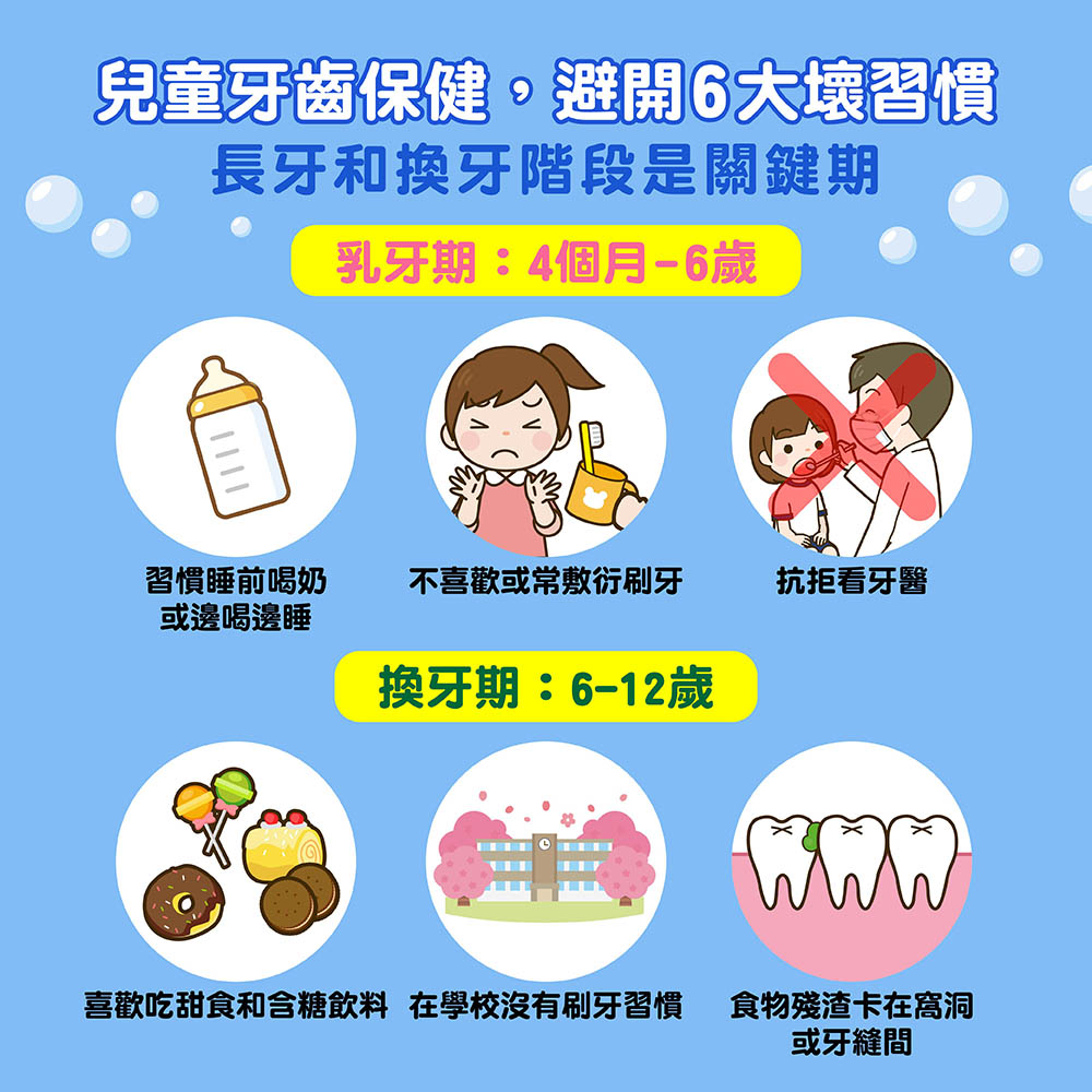 - 定期帶孩子做牙科檢查(通常建議每6個月檢查一次或依醫師建議塗氟頻率)。