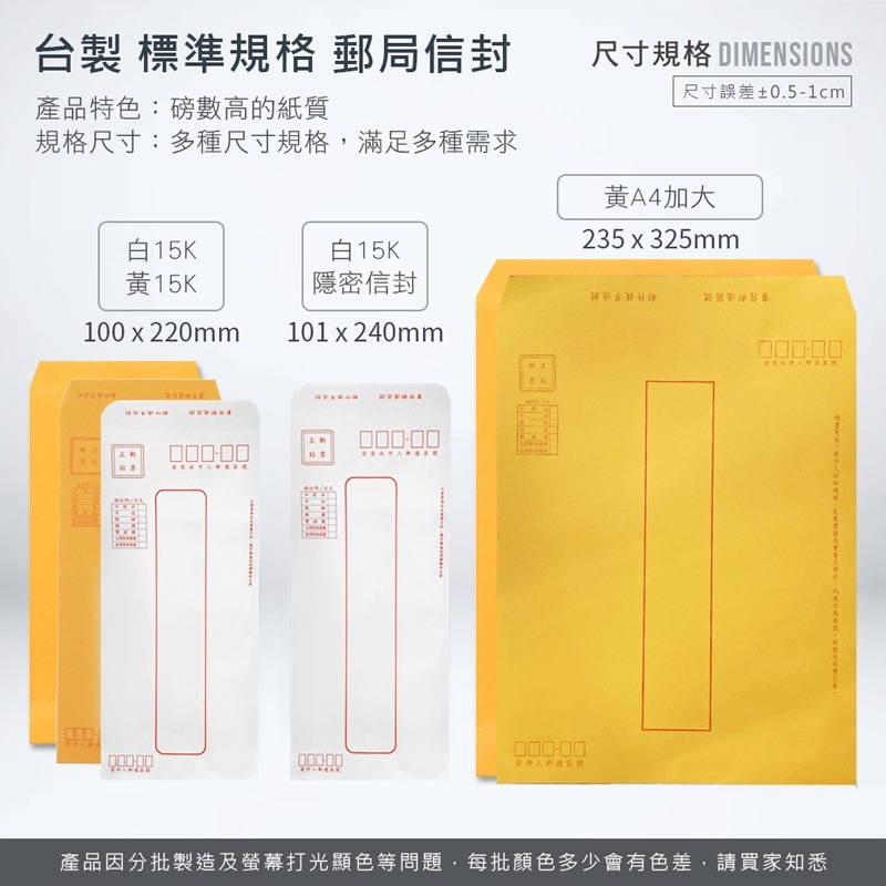 - 市售牛皮紙信封(如15K標準信封)價格較低,例如每50入約20-30元,但非郵局官方產品,可能不符合郵局規格。
