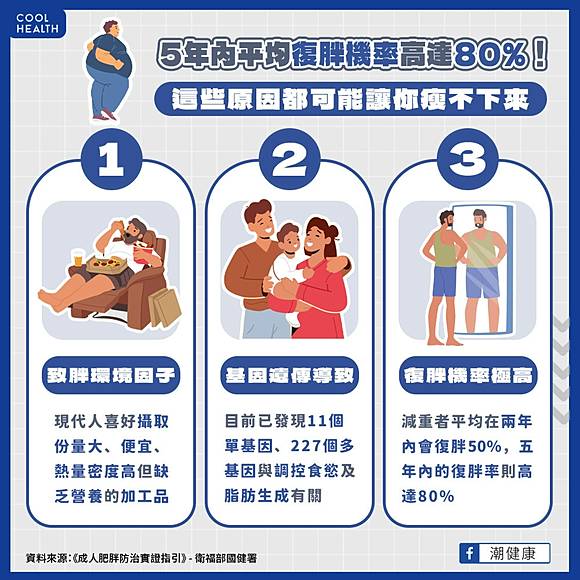 這些因素交互作用,熱量過多最終導致復胖,建議均衡飲食、穩定情緒與漸進減重以避免。