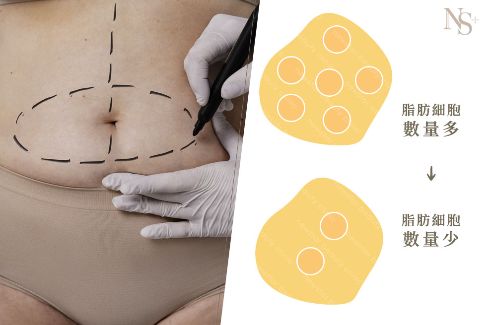- 脂肪細胞數量減少:抽脂直接抽出皮下脂肪細胞,使該部位脂肪總量永久降低,成年後脂肪細胞不會再生長,因此抽脂區相對不易復胖。