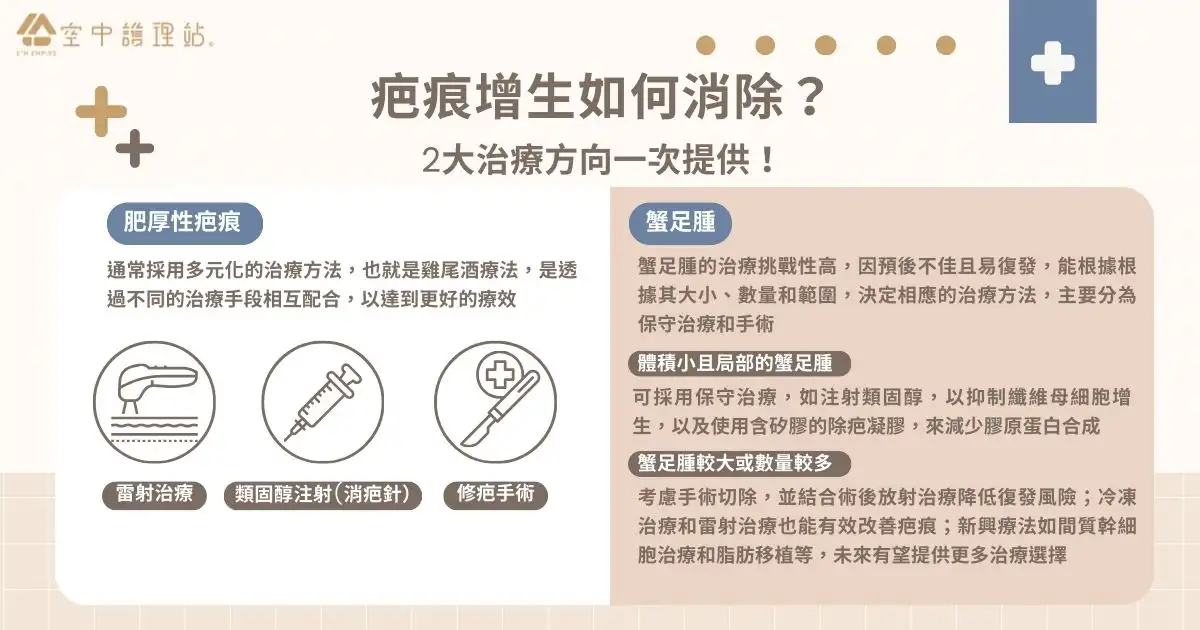 - 雷射治療:皮秒雷射、脈衝染料雷射或血管雷射,可減少疤痕形成,尤其適用燒燙傷。