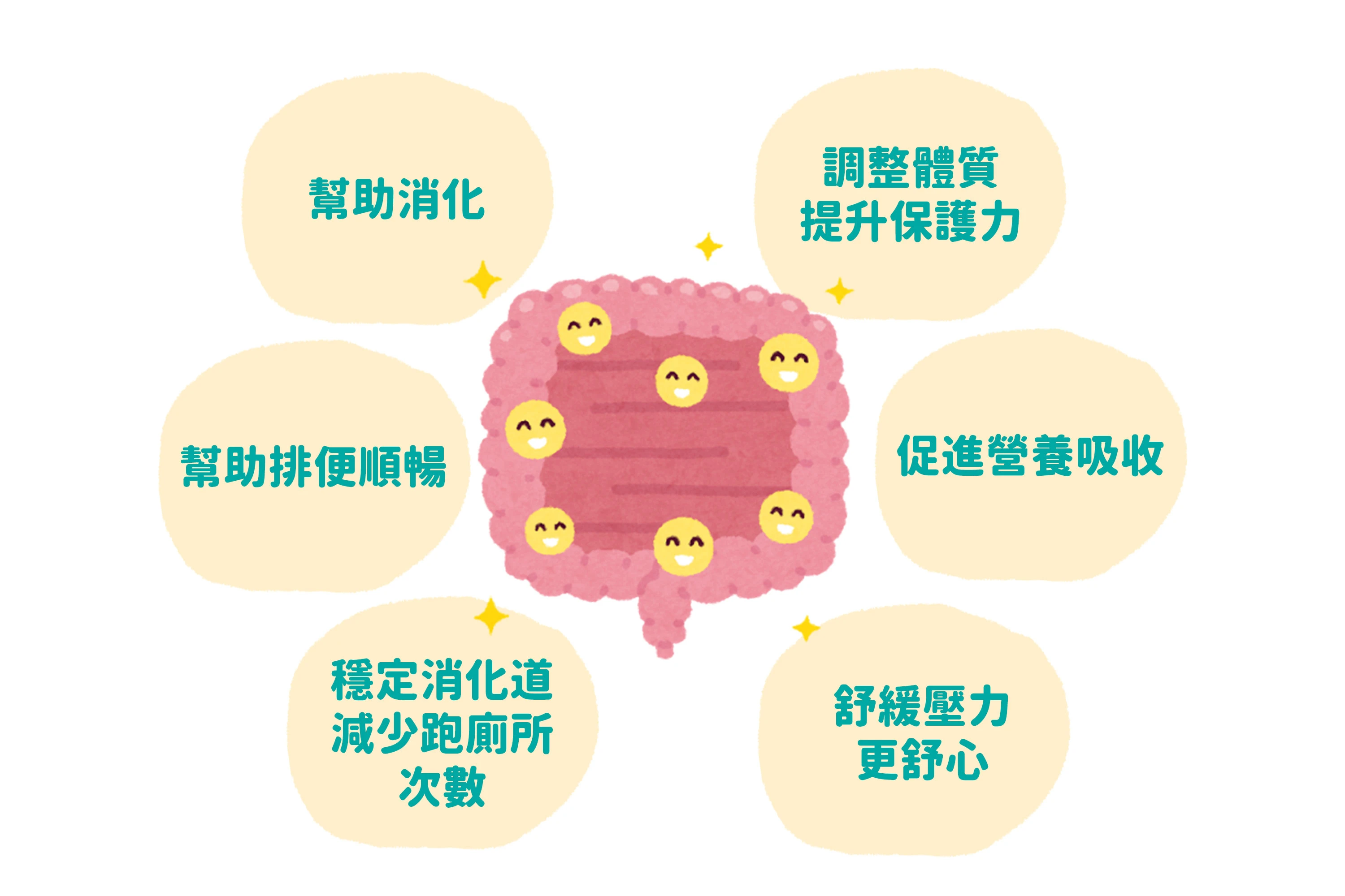 主要功效:益生菌能改變或維持腸道微生物生態、促進消化與排便順暢(例如減少便秘或縮短腸蠕動時間)以及協助恢復抗生素後的菌群平衡。