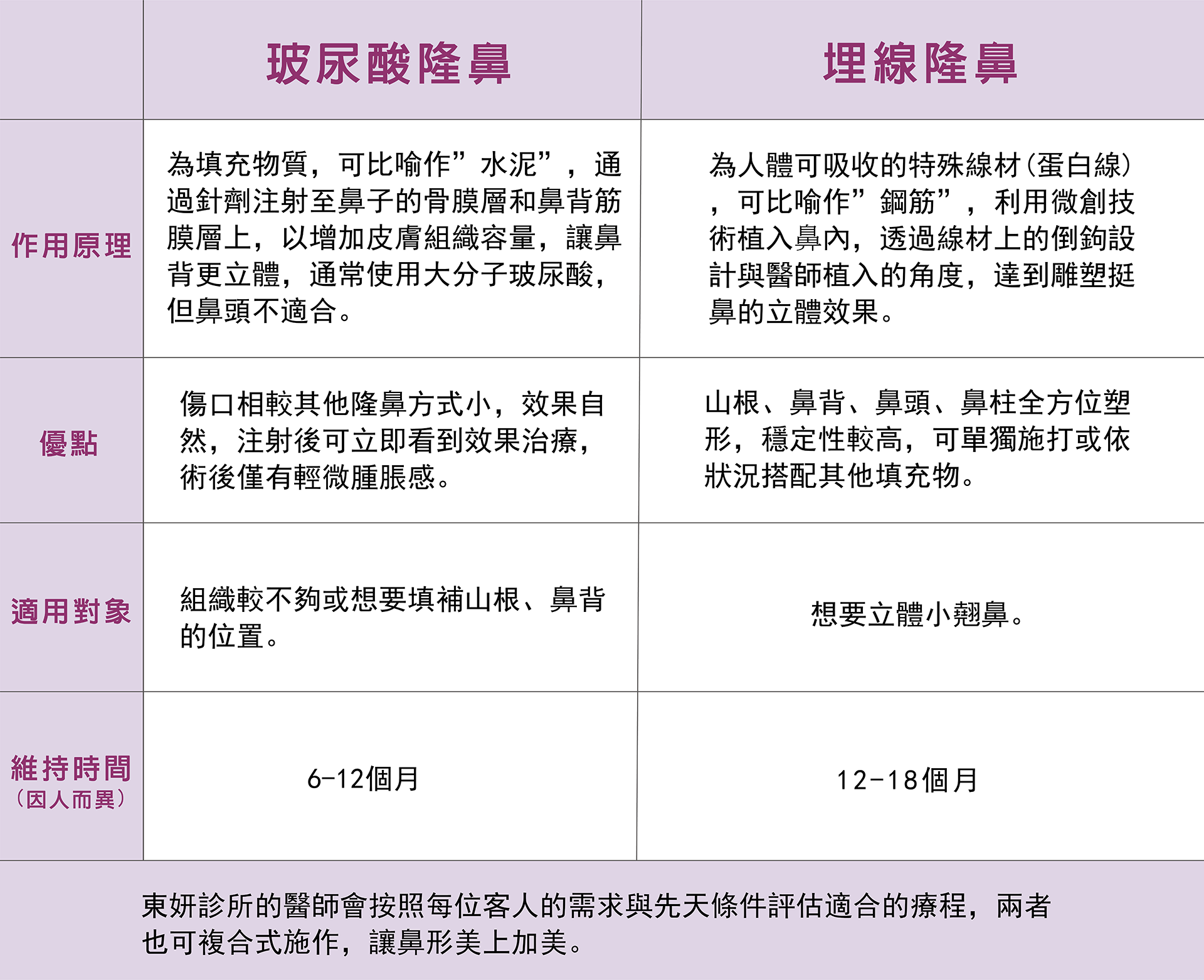 | 隆鼻方式 | 優點 | 缺點 | 維持時間 | 適合對象 | 費用參考(新台幣) |