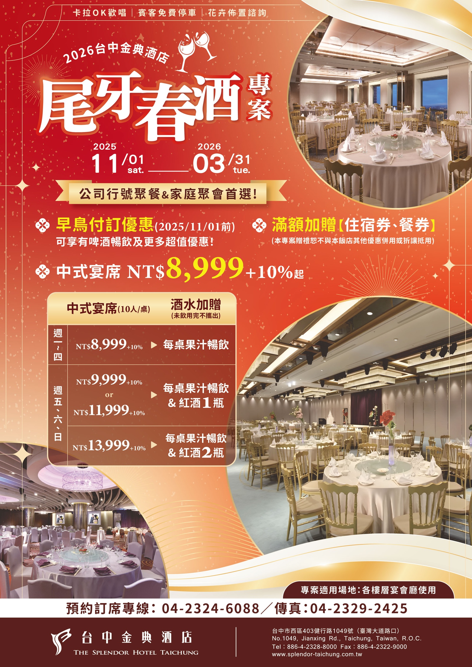 - 潮港城:專屬饗宴方案,平日每桌$6,666+10%起,假日$8,888+10%起,贈果汁暢飲。電話:04-23863337。