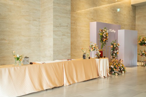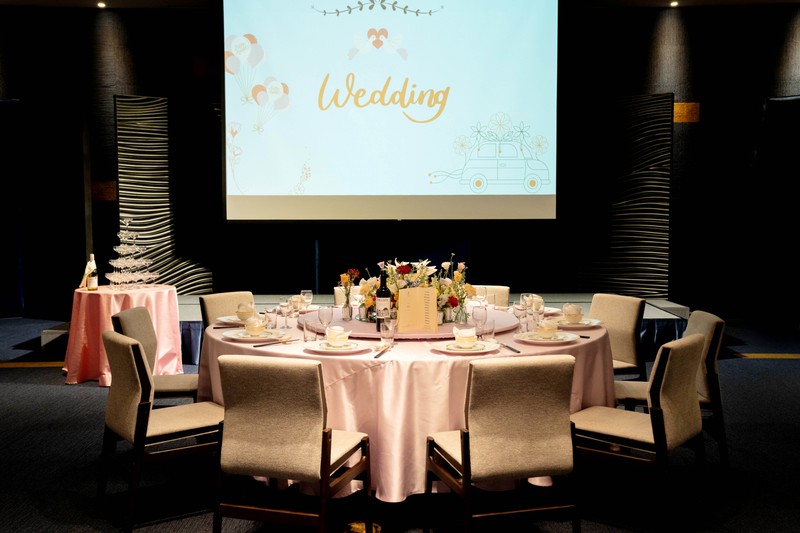 - 完整硬體設備:高規格影音(投影機、音響、麥克風)、專業燈光舞台、摸彩箱、桌卡等一站式服務,另有專屬新娘房。