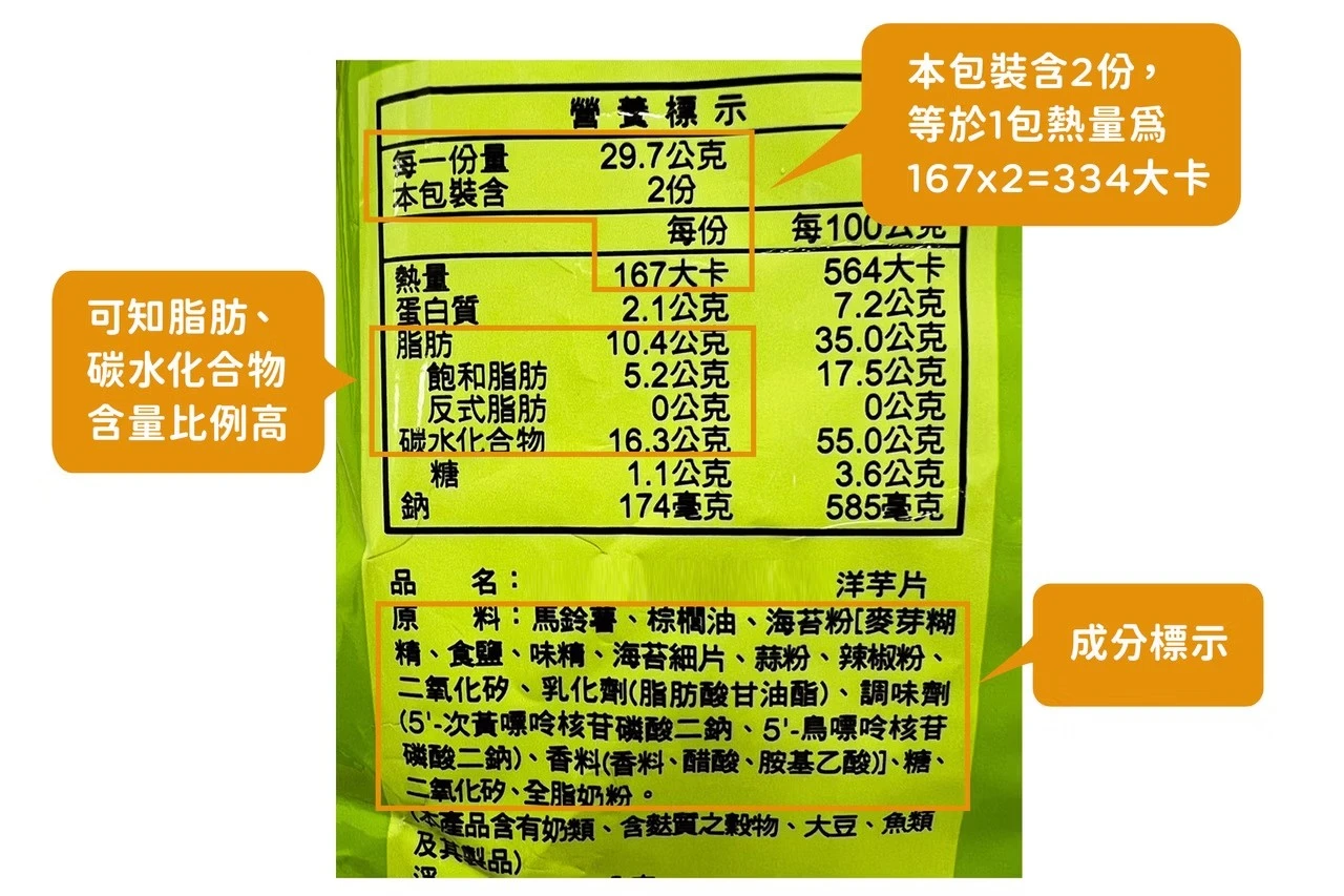 - 若前幾項成分是「蔗糖、果糖、葡萄糖、麥芽糊精、玉米糖漿」等,表示糖比例高,不適合當日常零食。