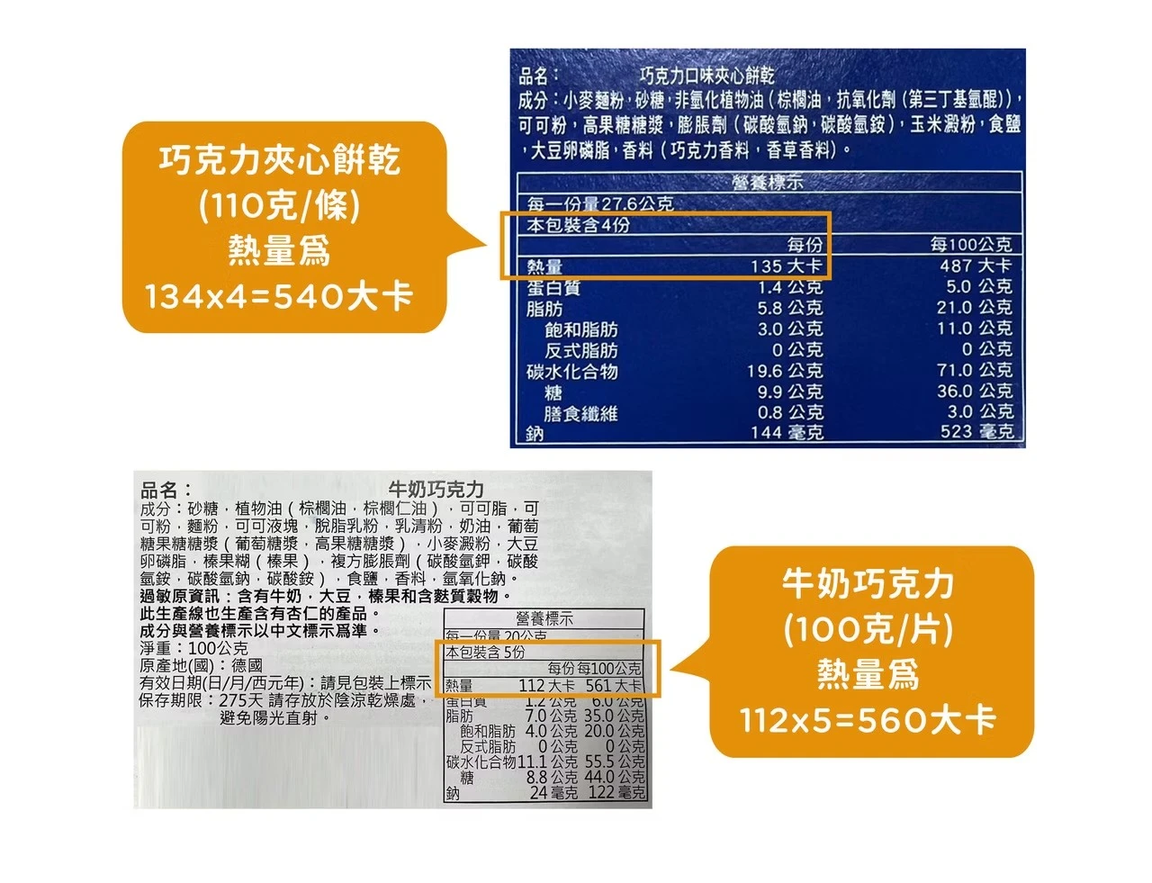 - 比較兩包餅乾的成分表,看哪一包「成分比較少」、「比較少糖」。