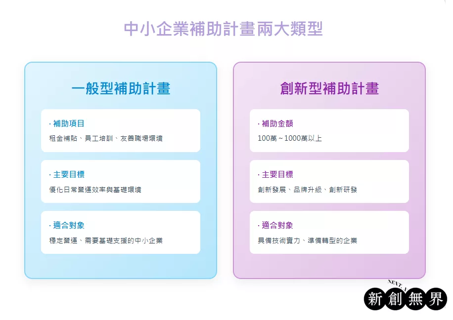 - 中小企業/創業補助(經濟部,非一般民生):針對製造/服務業,資格需公司淨值正值、無退票、營運2年以上等;金額100-550萬元(如SBIR、SIIR、CITD計畫)。