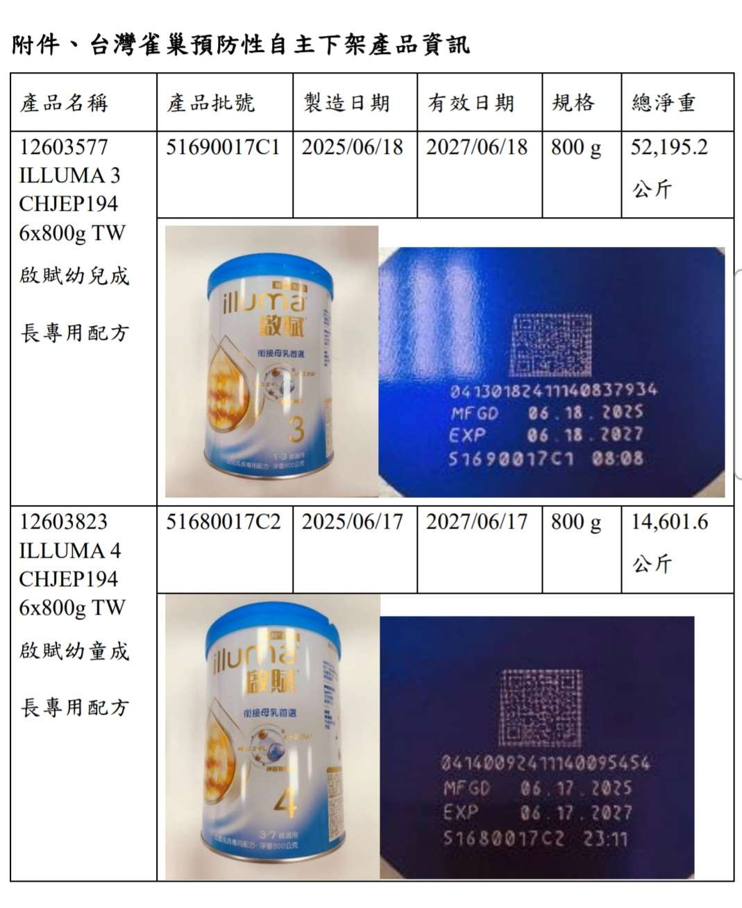 台灣預防性下架的產品為兩個批號: