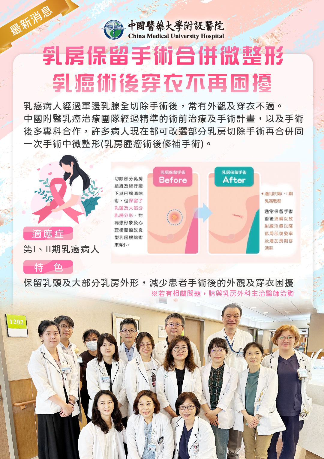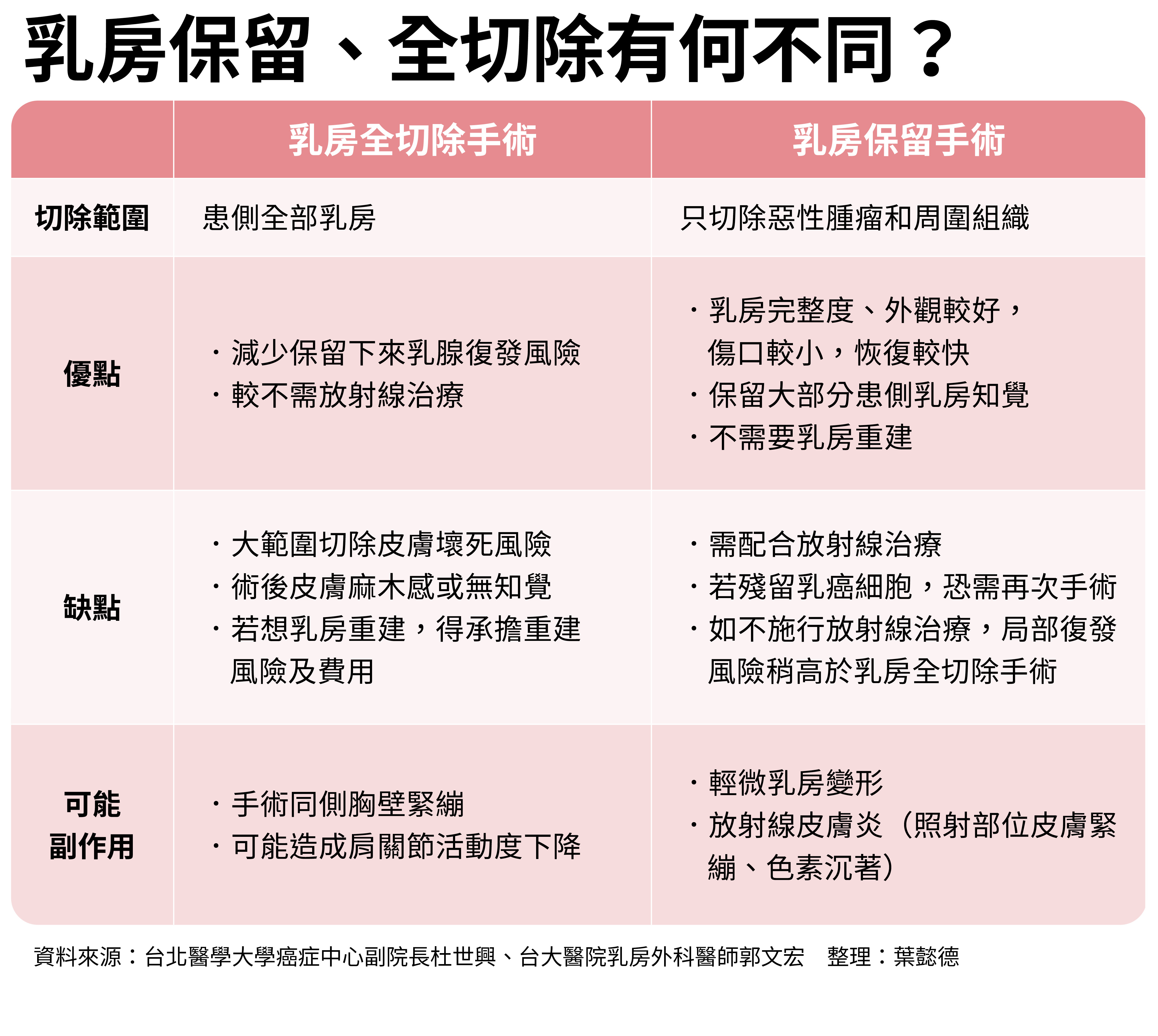 乳癌早期復發風險約20%,乳房保留手術(搭配放射治療)局部復發率與全切除相當,迷思認為保留手術復發更高已被研究駁斥。