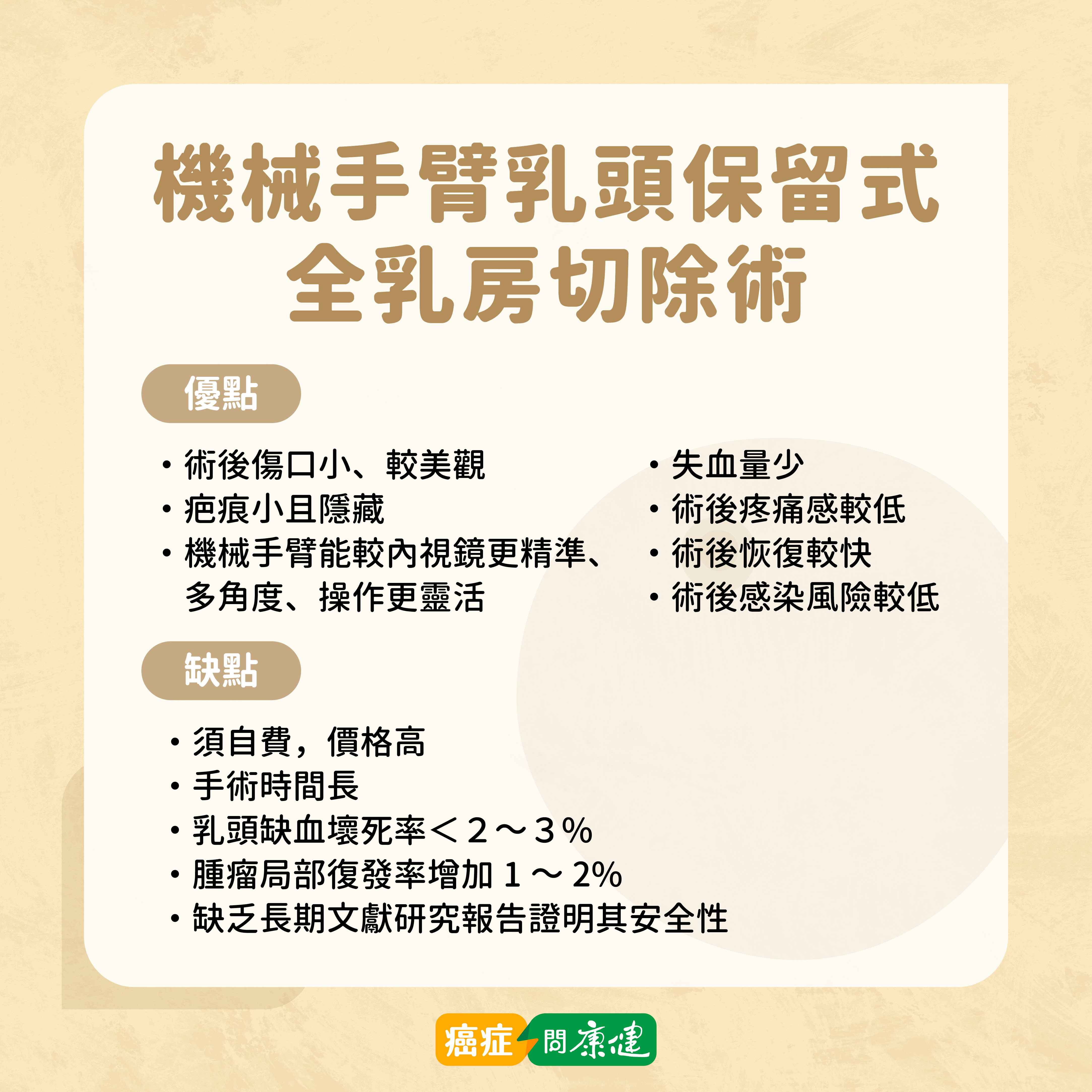 - 達文西內視鏡手術:追蹤時間不足,FDA曾警訊安全性,復發影響待更多研究。