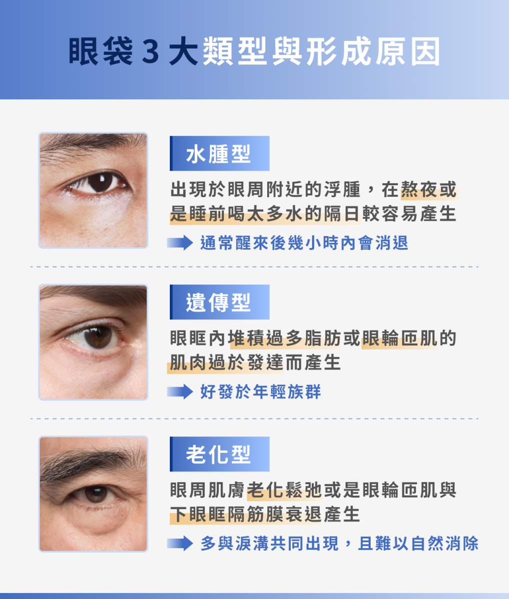 眼袋類型多樣(如脂肪型、鬆弛型),晚睡僅為誘因之一,非決定性因素;若無症狀,屬正常體質變異。