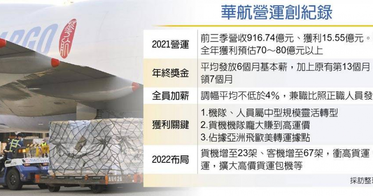 - 華航:前三季稅後純益122.5億元(年增8%),年終獎金平均約9.7至10個月(個人考績加定額獎金,如12萬元定額+2基數+4萬元激勵金),資深員工可達9.7個月,為國內航空業最高。