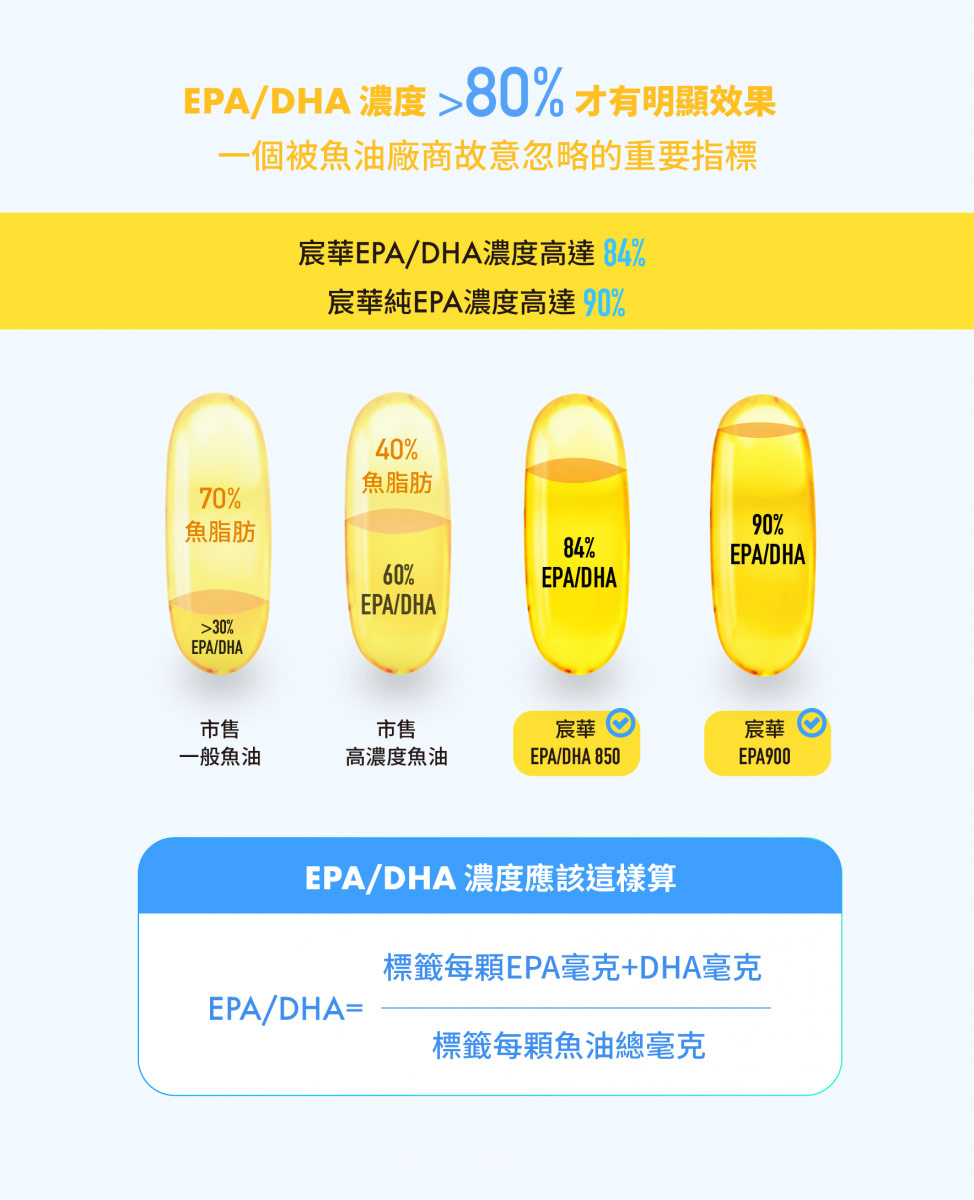 - 計算公式:濃度(%)= (EPA+DHA mg ÷ 魚油總重 mg) × 100%,魚油總重不含膠囊皮(如700mg總重減200mg膠囊=500mg魚油)。