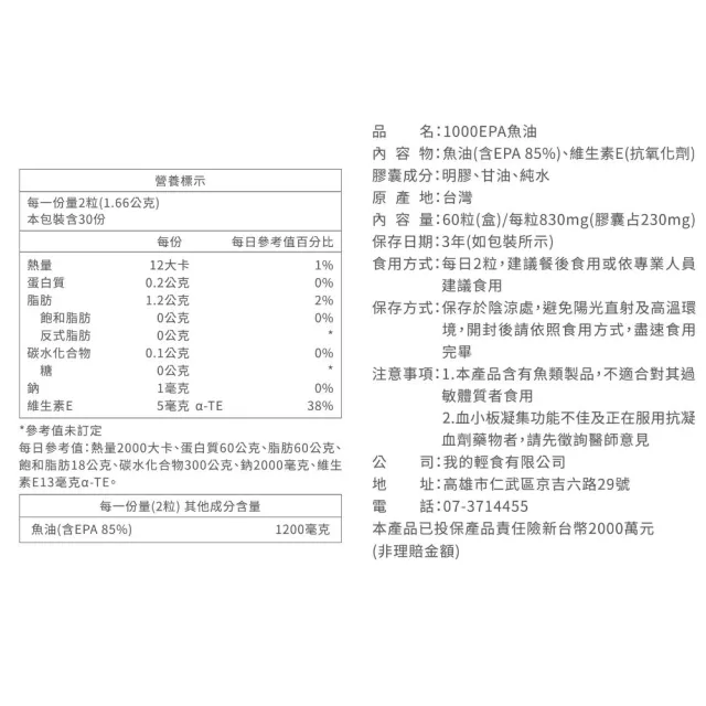 - 每日攝取量:台灣食品藥物管理局建議Omega-3脂肪酸不超過2公克/日
