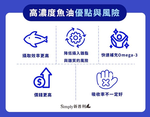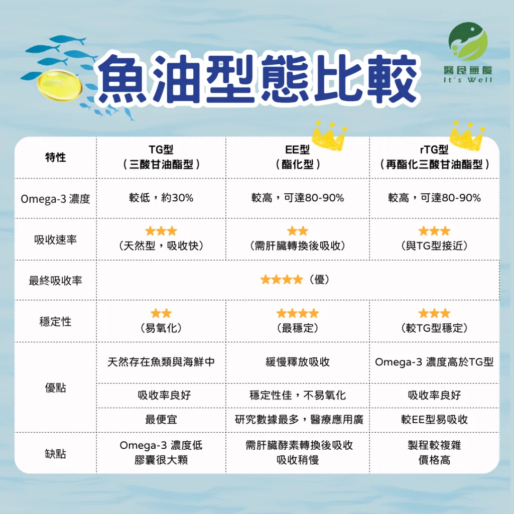 吸收率依魚油型態而異,rTG型(再酯化三酸甘油酯)最佳,兼高濃度(>80%)與高生物利用率,優於TG型(天然,30-50%)與EE型(酯化,吸收低)。