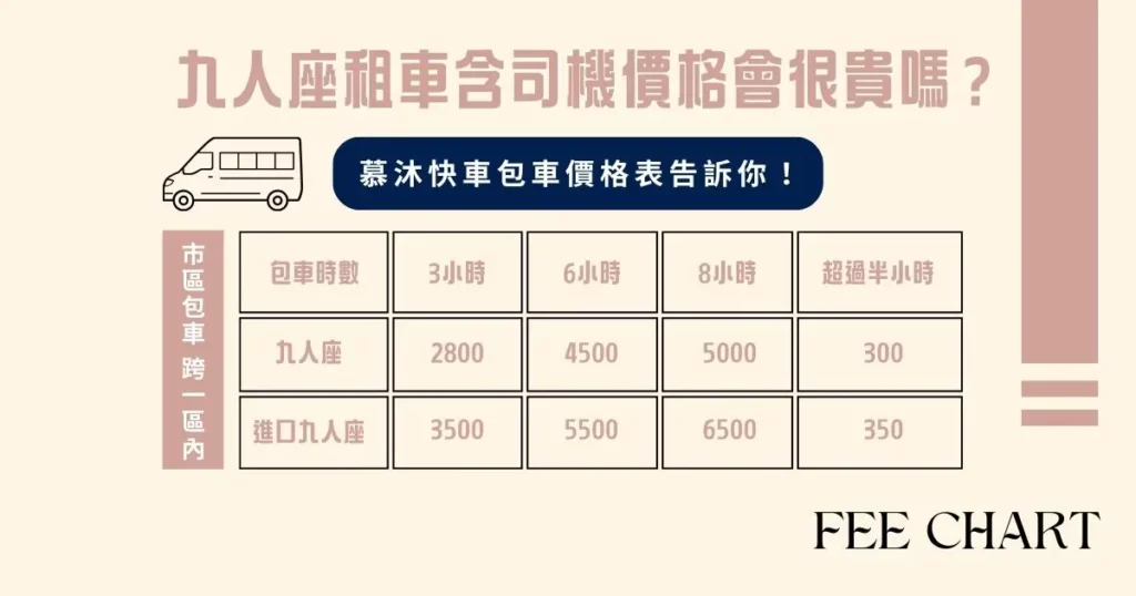 包車以小時或半天計,一口價不怕塞車,台北市區行情(以9人座為例):