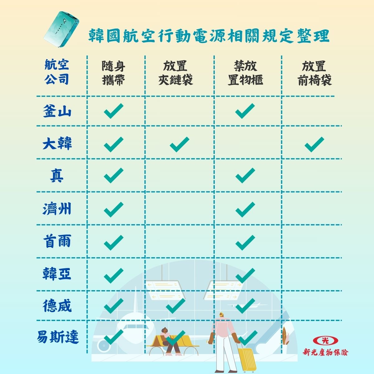 - 攜帶方式:必須隨身攜帶,不可託運;避免放置於座位上方置物櫃或座位上,建議置於座椅下或妥善包裝(如原包裝、絕緣膠帶或透明塑膠袋),防止擠壓或短路。