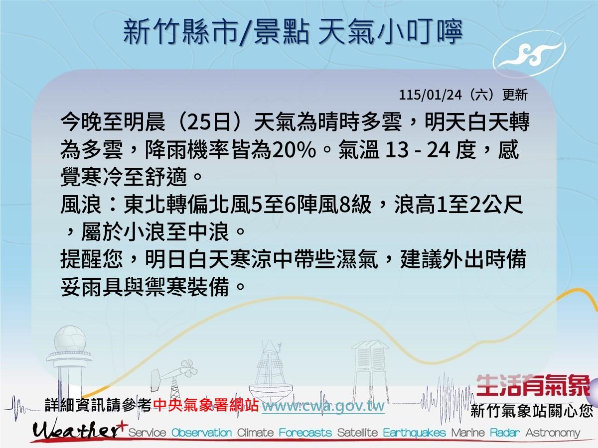 不過需要留意的是,下週二至下週三(1月28~29日)將再次受東北季風或大陸冷氣團影響,新竹以北及東部地區會轉為濕涼天氣,所以明天確實是近期較好的天氣窗口。