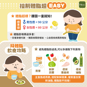 - 腰圍標準:成年男性>90公分、女性>80公分,即警訊內臟脂肪過多,腹部脂肪與心血管風險正相關,四肢脂肪影響較小。