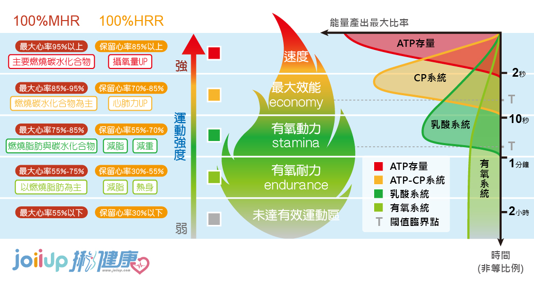 - 心率區間:維持最大心率的55%-85%為最佳燃脂區,能以脂肪和碳水化合物為主,提供能量;超過85%則偏向消耗碳水。