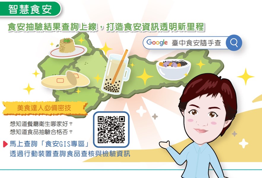 台中市食品藥物安全處透過「臺中食藥安智慧雲-食安GIS專區」網站公開食品稽查及抽驗結果,供民眾查詢。