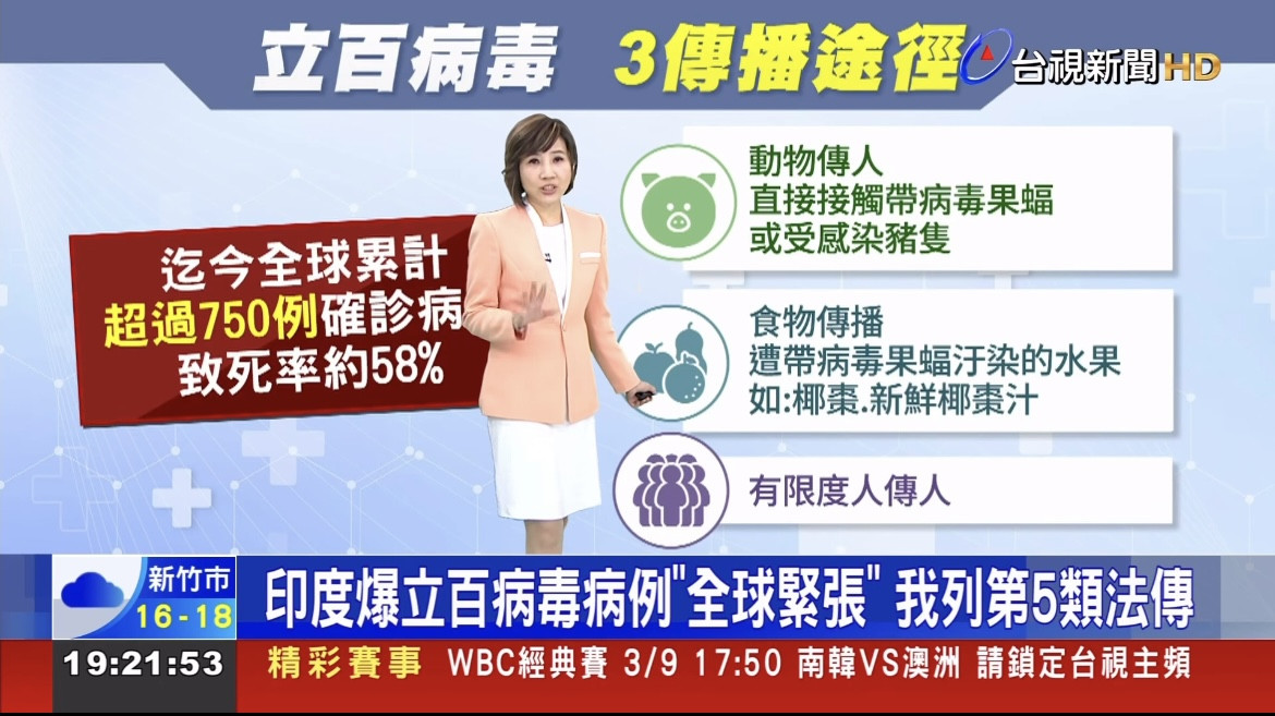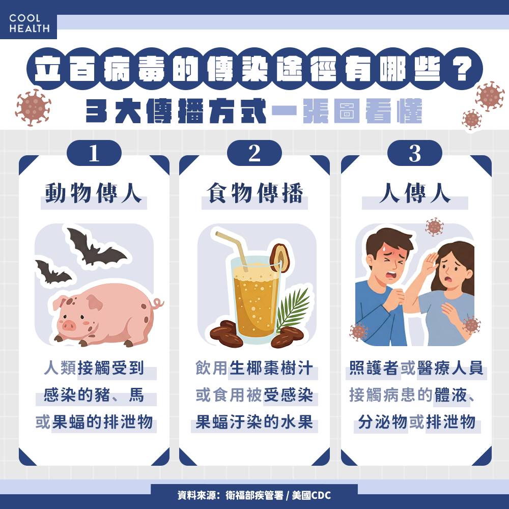 - 勿生飲椰棗樹汁(或野棗樹汁):病毒可在其中存活達7天,前往流行地區(如印度、孟加拉)時嚴禁飲用未經加熱或滅菌的樹汁。