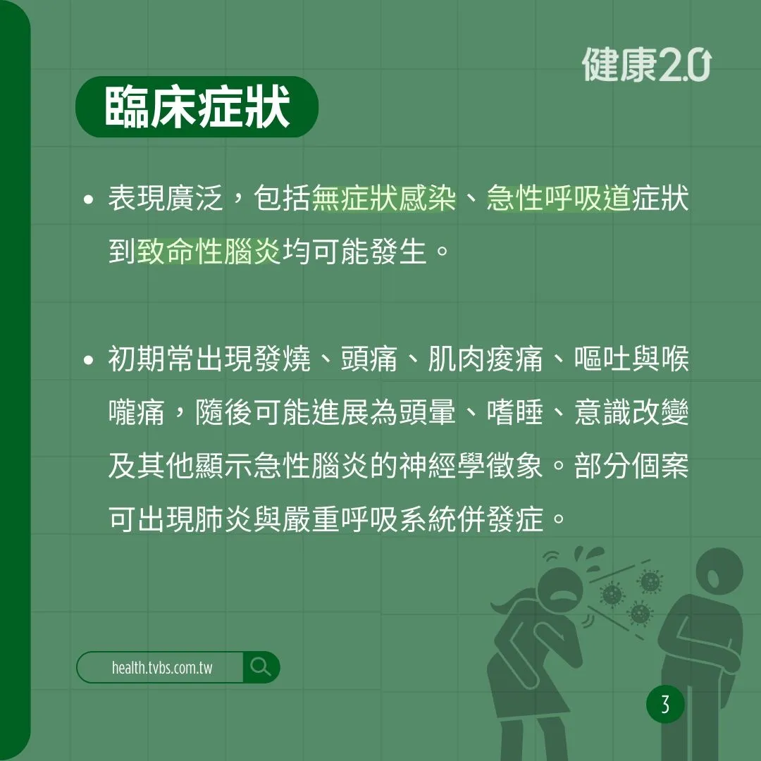 - 嚴重腦炎或癲癇時,使用抗癲癇藥物或加護照護。