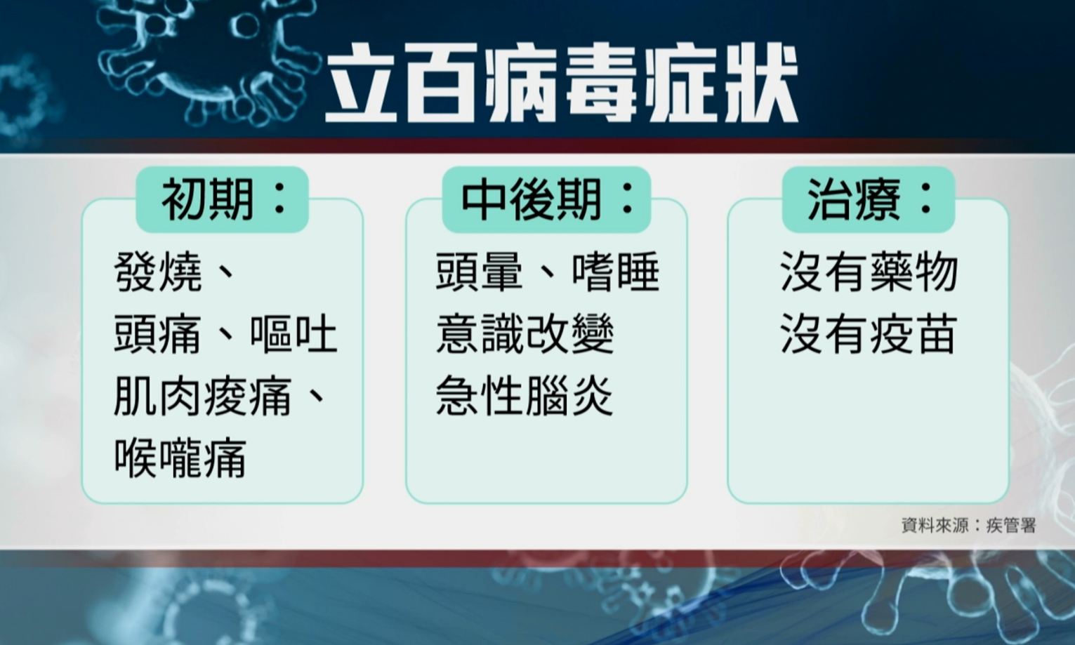 全球無核准疫苗,WHO與各國正積極研發抗病毒藥物與疫苗,但尚未有臨床可用成果。 台灣將立百病毒列為第五類法定傳染病,預防依賴避免接觸果蝠、豬隻污染食品及病患體液,並落實洗手與院內感染管制。