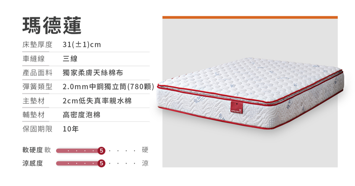 - 包覆支撐佳:睡感柔軟服貼,分散壓力,適合側睡者或喜愛軟床族群;結合親水棉與高科技乳膠,提供均勻紓壓,脊椎舒適。